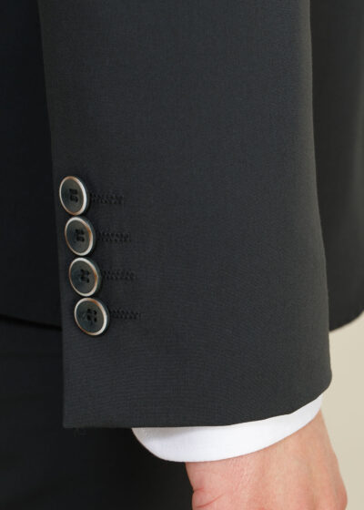 Además, este traje suele estar confeccionado con telas de alta calidad, como la lana o el algodón, lo que le da un acabado suave y elegante al tacto. También cuenta con detalles como solapa picada al canto, botones finos y bolsillos con líneas rectas, que realzan su diseño minimalista y moderno.