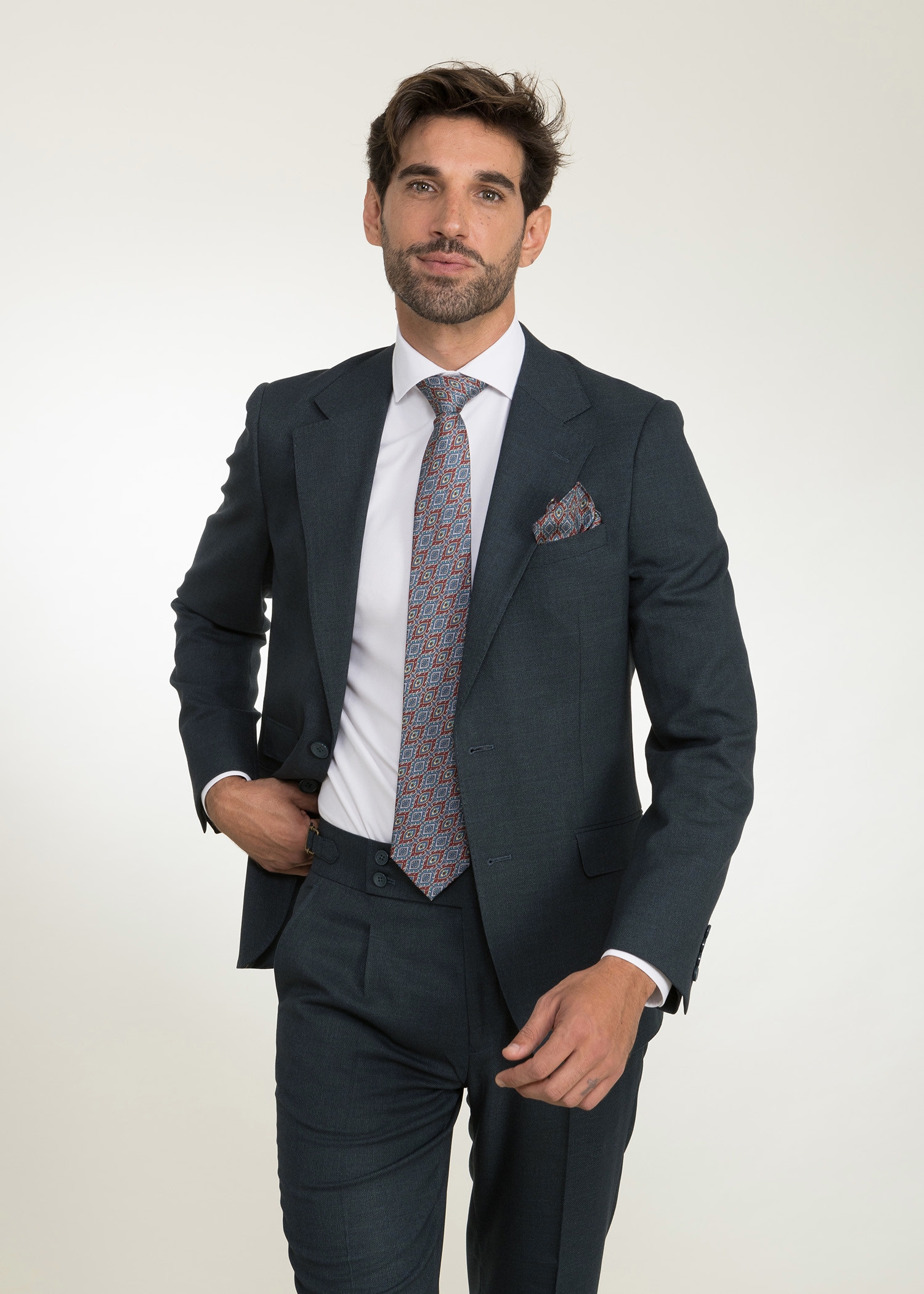 Traje de corte SLIM FIT, solapa ancha de pico, cierre de un botón y bolsillos inclinados, su pantalón es de tiro corto con cintura con ajustes laterales de hebilla y bajo de 16, el largo de la americana es 70.